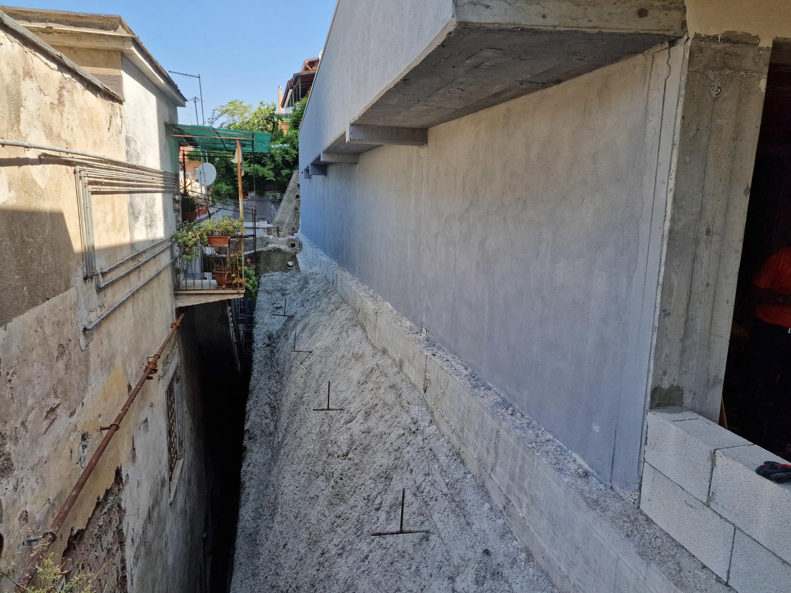 A seguito del cedimento del muro di confine tra due lotti condominiali con un dislivello di circa 4 metri, si è reso necessario un intervento complesso di messa in sicurezza del dislivello e di ricostruzione della volumetria danneggiata. Il muro, in precedenza adibito alla funzione di contenimento del terreno, aveva garantito per decenni la stabilità dell’area, ma la sua stabilità è andata via via diminuendo a causa della spinta del terreno e degli agenti atmosferici, oltre che al degrado strutturale del paramento stesso, non soggetto ad alcun genere di manutenzione. L’obiettivo dell’intervento è stato duplice: stabilizzare in modo definitivo il fronte franato e recuperare lo spazio perso, trasformandolo in un’opportunità funzionale per il condominio.